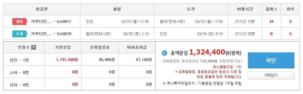 1. 항공편 - 가루다항공 / 대한항공 중 택1