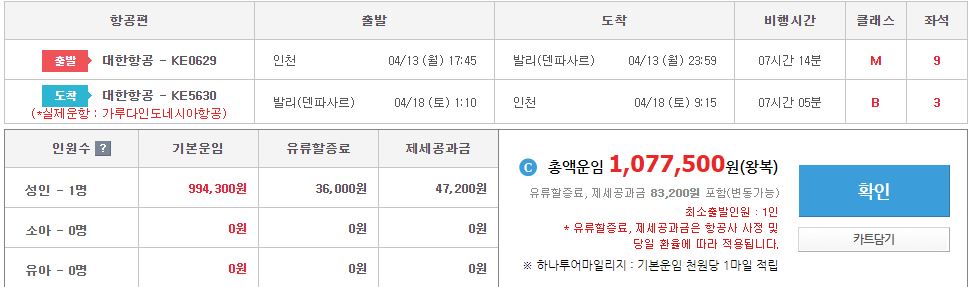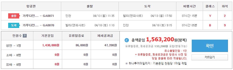 1. 항공편 - 가루다항공 / 대한항공 중 택1