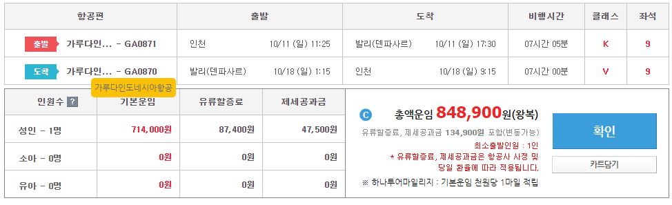 1. 항공편 - 가루다항공 / 대한항공 중 택1