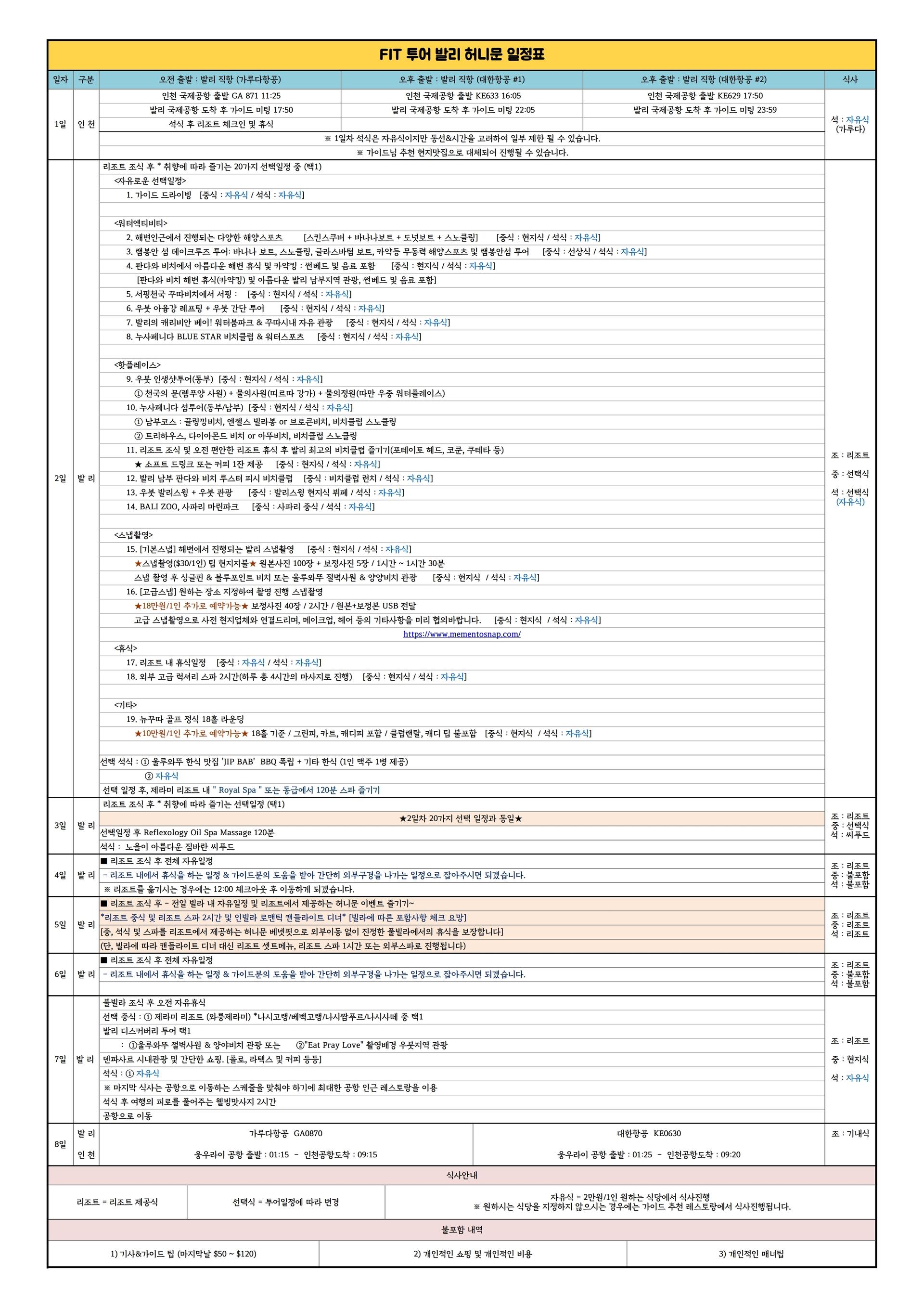 현재 보시기 편하도록 일정표상의 리스트로 나열하였지만, 일정표상 없는 일정을 원하셔도 변경이 가능합니다. 단, 금액이 많이 추가되는 일정의 경우에는 차액만금 추가금이 있습니다.