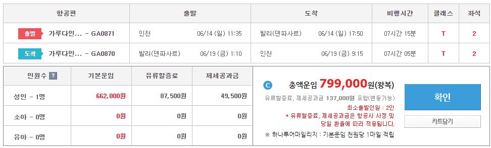 1. 항공편 - 가루다항공 / 대한항공 중 택1